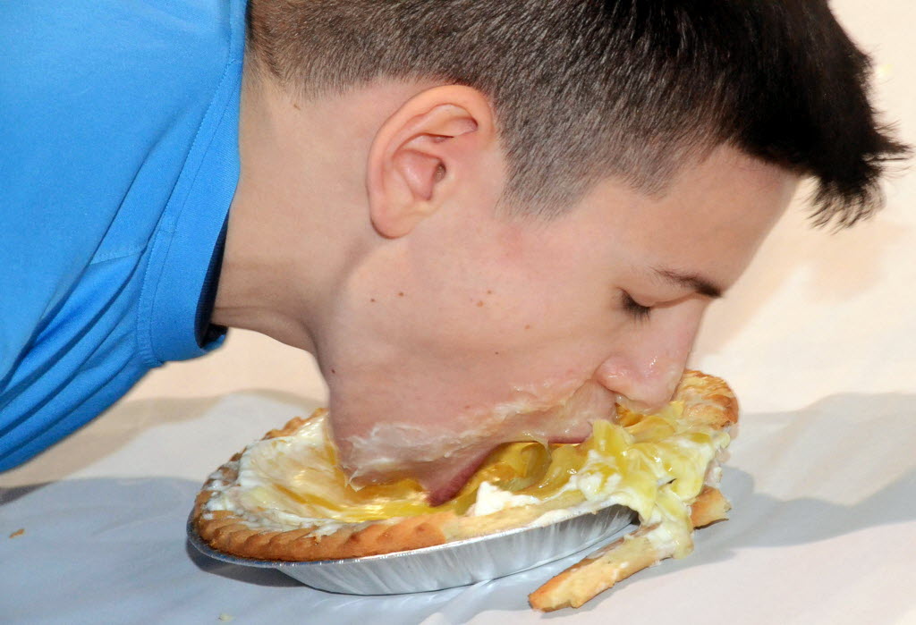 Max Schwabe eats a lemon pie during a pie-eating contest at Holy Family Academy on Monday in Hazleton, Pa. The students were celebrating Pi Day, the ratio of the circumference of a circle to its diameter. You write the cutline. (Ellen F. O’Connell/Hazleton Standard-Speaker via AP)