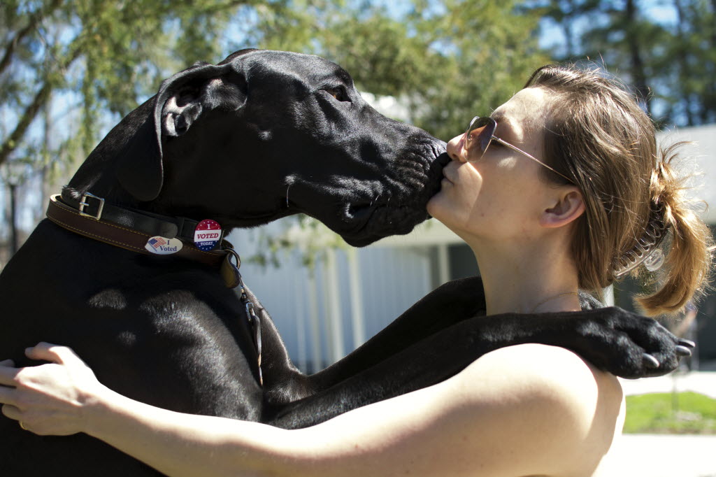 Anna Henke, right, kisses her Great Dane, Endeavour, 2, outside Church Of Reconciliation after voting in Chapel Hill, N.C., Tuesday. Voters in Missouri, as well as Illinois, Florida, Ohio and North Carolina are casting their ballots in primary elections Tuesday. (Whitney Keller/The Herald-Sun via AP)