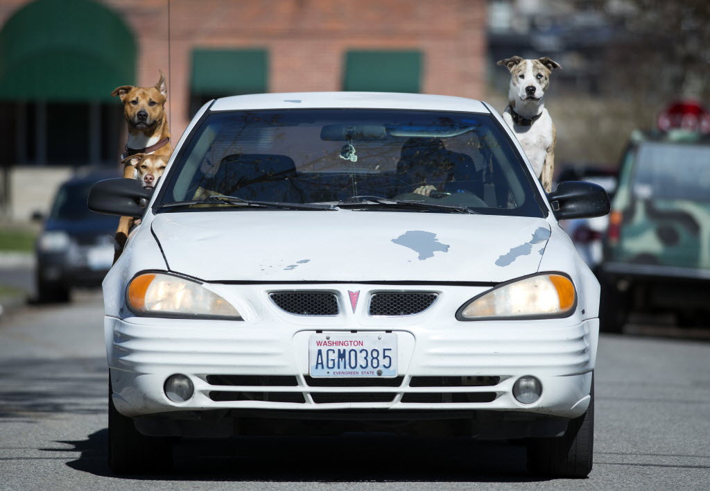 Misty Olson takes her three dogs for a drive around Brownes Addition, Wednesday, in Spokane. Olson says the dogs look forward to their daily drive, and she enjoys the social time they have together before she has to go work. (Colin Mulvany/SR photo)