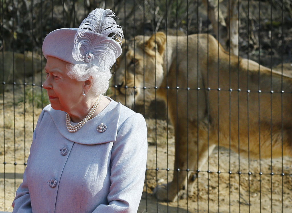 Britain’s Queen Elizabeth II stands in front of an Asiatic lioness during a visit to officially open the new Land of the Lions, at London Zoo, Thursday. You write the cutline. (AP Photo/Kirsty Wigglesworth)