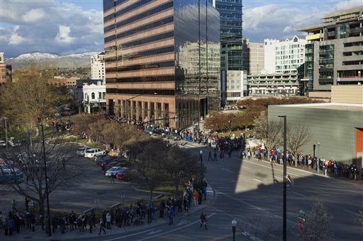 By 5:30 p.m. — just a half hour after doors opened at a downtown Boise event center and sports stadium — lines of eager had wrapped three city blocks waiting to get in. The doors were supposed to be locked to any new-comers at 7 p.m. so the caucus proceedings could begin. But with hundreds still waiting, officials postponed the start time until everyone could be register for the event.