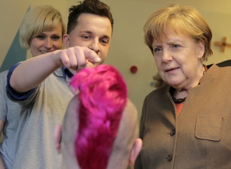 German Chancellor Angela Merkel watches Alex as he styles the hair of a person during her visit to the Don Bosco youth center in Berlin, Germany Tuesday. You write the cutline. ( Kay Nietfeld/Pool Photo via AP)
