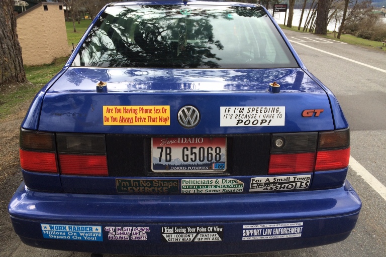 Among many on the back of a dark-blue VW GT, with Bonner County plates (parked along the Dike Road, adjacent to North Idaho College this lunch hour: “Are you having phone sex, or do you always drive this way?” (Greg Lee/SR)