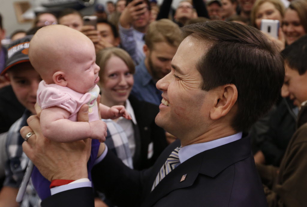 Republican presidential candidate, Sen. Marco Rubio, R-Fla., holds up 3-month-old Evelyn Bernard at a campaign rally in Idaho Falls, Idaho, Sunday. You write the cutline. (AP Photo/Paul Sancya)