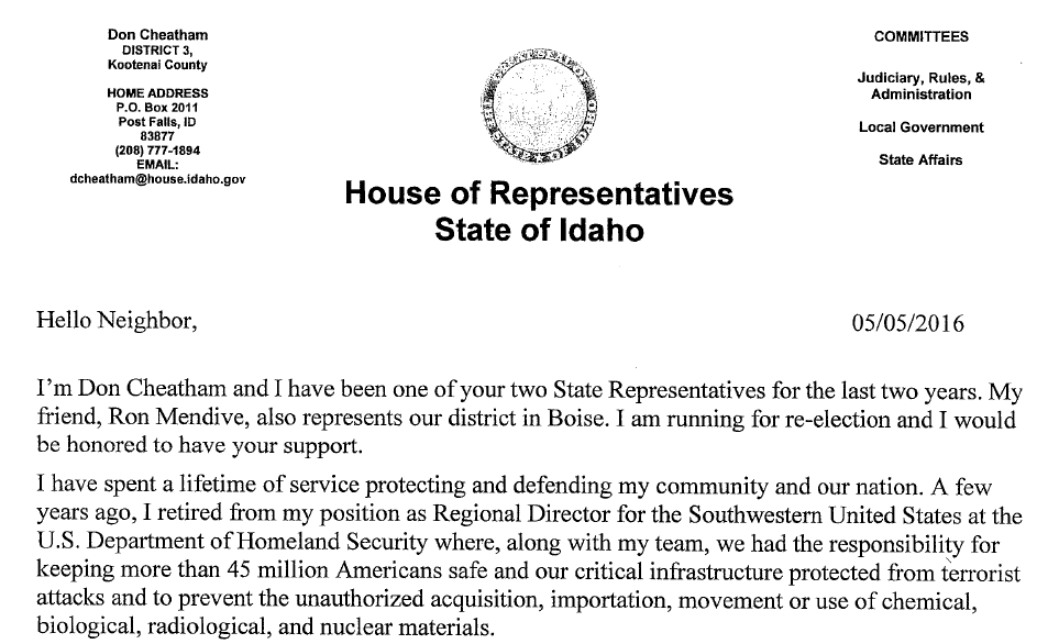 Hmm. Some residents in House District 3 are buzzing about a mass political mailing by state Rep. Donald Cheatham, R-Post Falls, on what appears to be a letterhead from the Idaho House of Representatives. Cheatham has a disclaimer at the bottom that sez all costs associated with the mailing were paid for by his campaign. Dunno if it’s OK to do something like this. But I can see why there’s concern. Copy of full letter here.