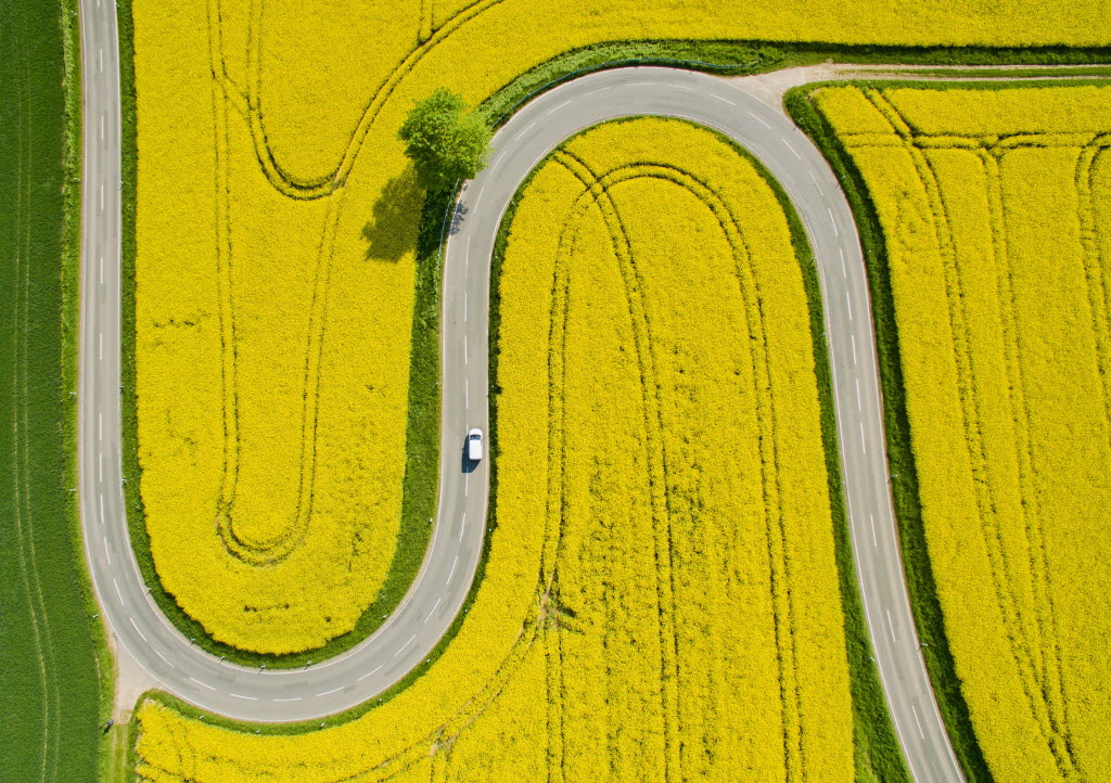 An aerial view shows a car making its way on a road through flowering canola fields on a serpentine section of the L401 highway near Nienstedt, Germany, Thursday. (Julian Stratenschulte/dpa via AP)