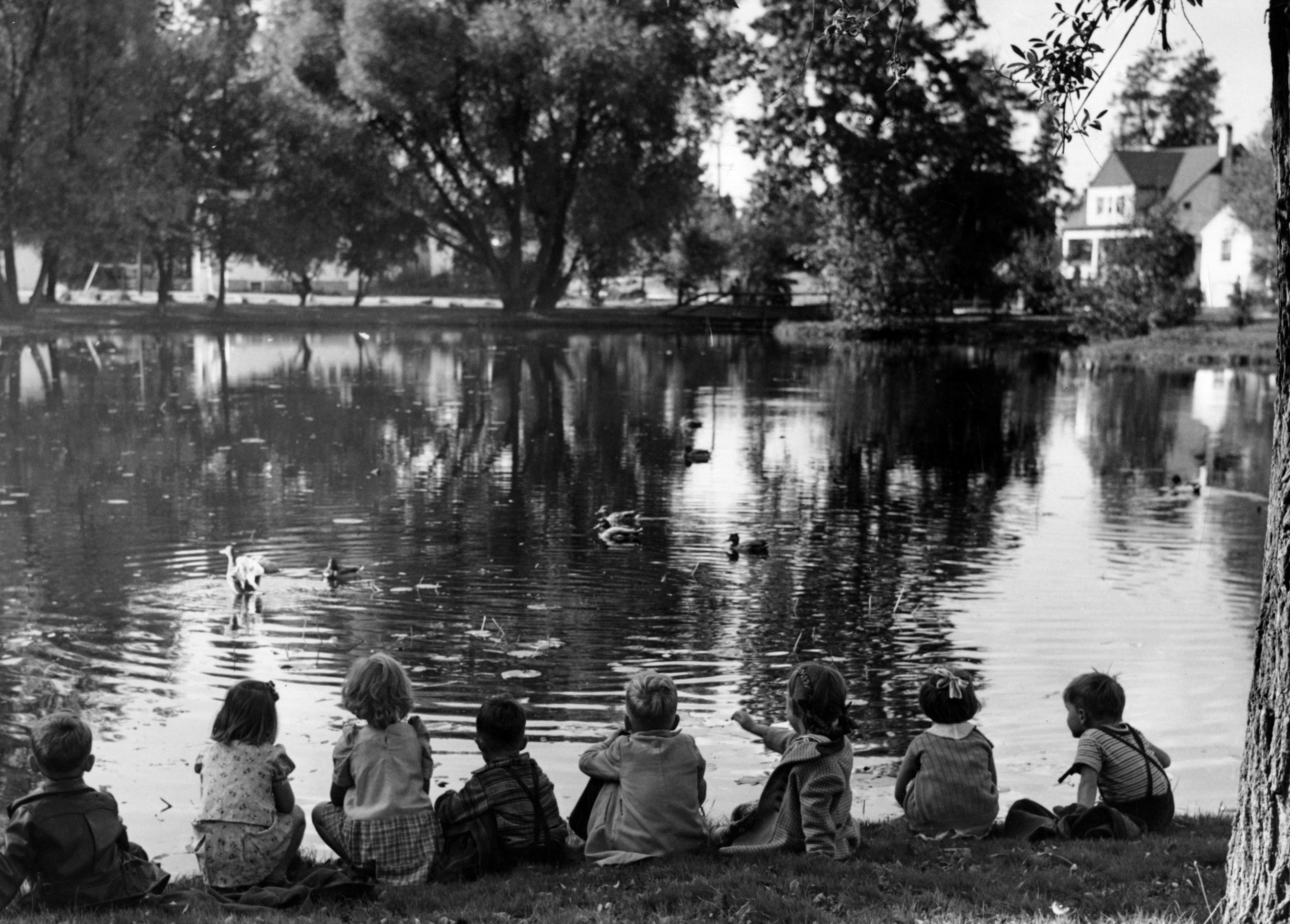 S-R Archive find of the day: In this Oct. 17, 1943 photo, Indian summer has touched its magic wand to Manito park, clothing the ground, trees and shrubs in a riot of fall colors. Taking in the beauty of the scene and visiting the wild ducks on the park pond are visitors from the Lincoln child care center.