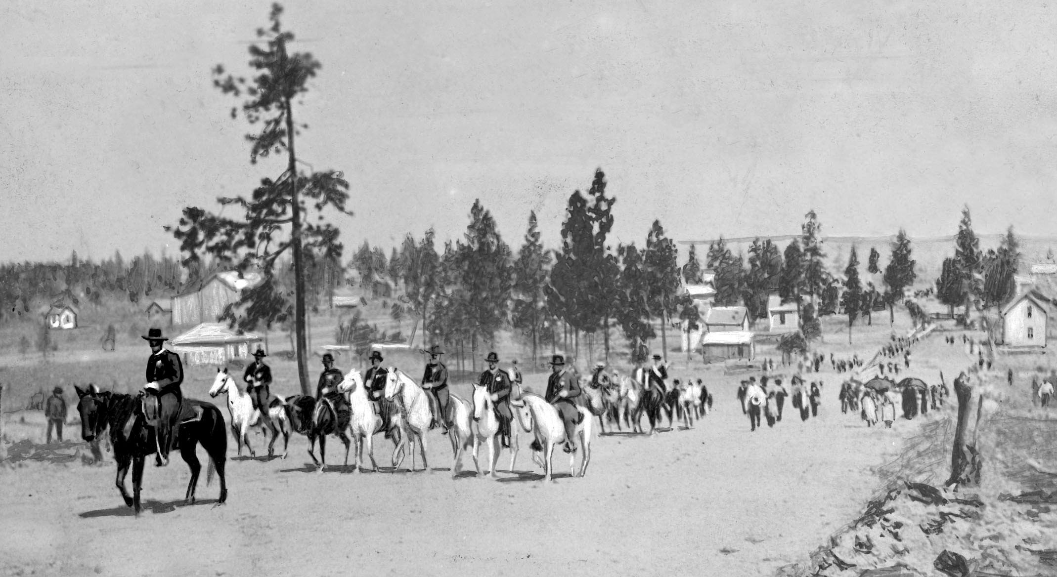 S-R Archive find of the day: The first observance of Memorial day in Spokane was held Friday, May 30, 1884. The parade in the photo was moving along Second Avenue, en route to the cemetary on Cannon hill. The procession was led by Frank Johnson, marshal of the day, followed by personnel of the police force, including the town marshal, Joe Warren. Members of Sedgwick post followed, then Pynn’s band and all the men who had served any time under the flag. After decoration of the graves, the company dispersed.