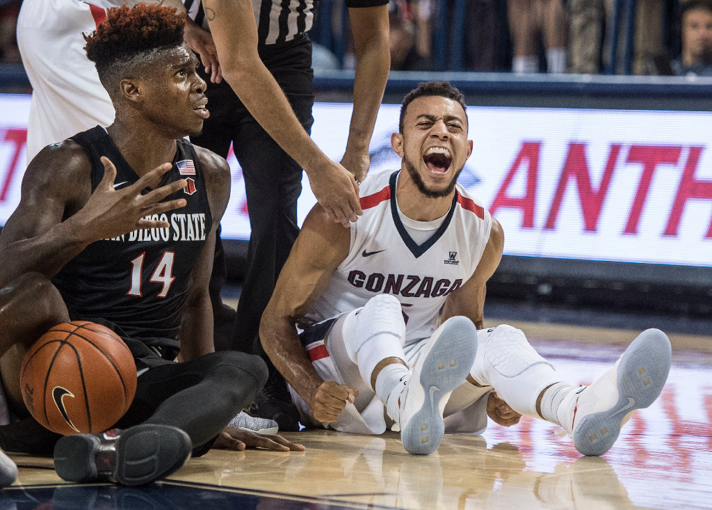 Gonzaga guard Nigel Williams-Goss roars with delight after tying up San Diego Stateforward Zylan Cheatham, Nov. 14, 2016, in the McCarthey Athletic Center. Story below. (Dan Pelle/SR photo)