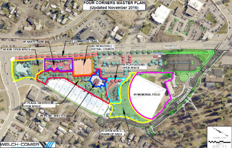 ignite cda was given a first look at the next phase of the ongoing Four Corners project (Northwest Boulevard/Fort Grounds Drive). The first phase involved reconstruction of what is now Fort Grounds Drive, which separates City Park from Memorial Field. The next phase will take place in the middle of 2017, in conjunction with construction of a joint city-county parking lot on the west side of NW Blvd, opposite the county courthouse grounds. The next phase of 4 Corners will involve purchase of property, a land-swap with the city, and realignment of N Park Drive. Also, it appears from the photo above that the realignment will lead to construction of a pickleball court, two park settings, and possible move of Skate Park. At the ignite cda meeting, Parks Director Bill Greenwood said that Memorial Field will be kept as a softball only field. There was discussion about preservation of the historic grandstand. You can read the discussion in the minutes of ignite cda here.