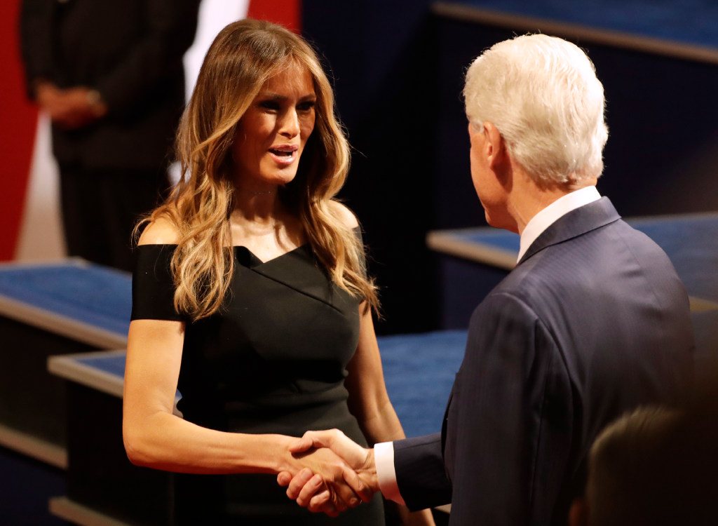 Melania Trump, wife of Donald Trump shakes hands with Bill Clinton before the presidential debate between Democratic presidential nominee Hillary Clinton and Republican presidential nominee Donald Trump at Hofstra University in Hempstead, N.Y., Monday, Sept. 26. You write the cutline. (AP Photo/Patrick Semansky)