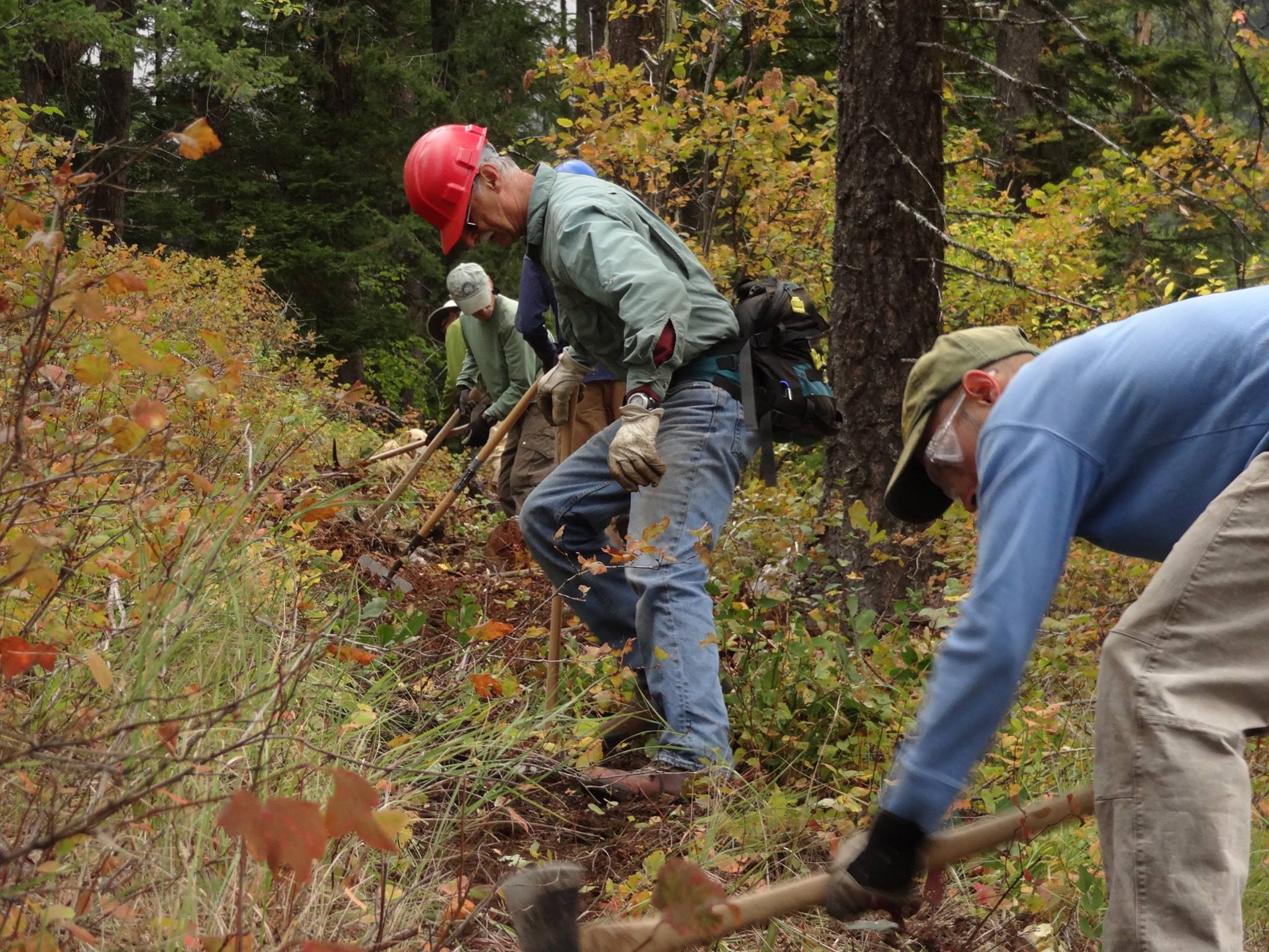Volunteers spent two days cutting back brush and digging a new section of trail to reduce the grade. The work party of 29 volunteers, included eight students from Sandpoint High School.