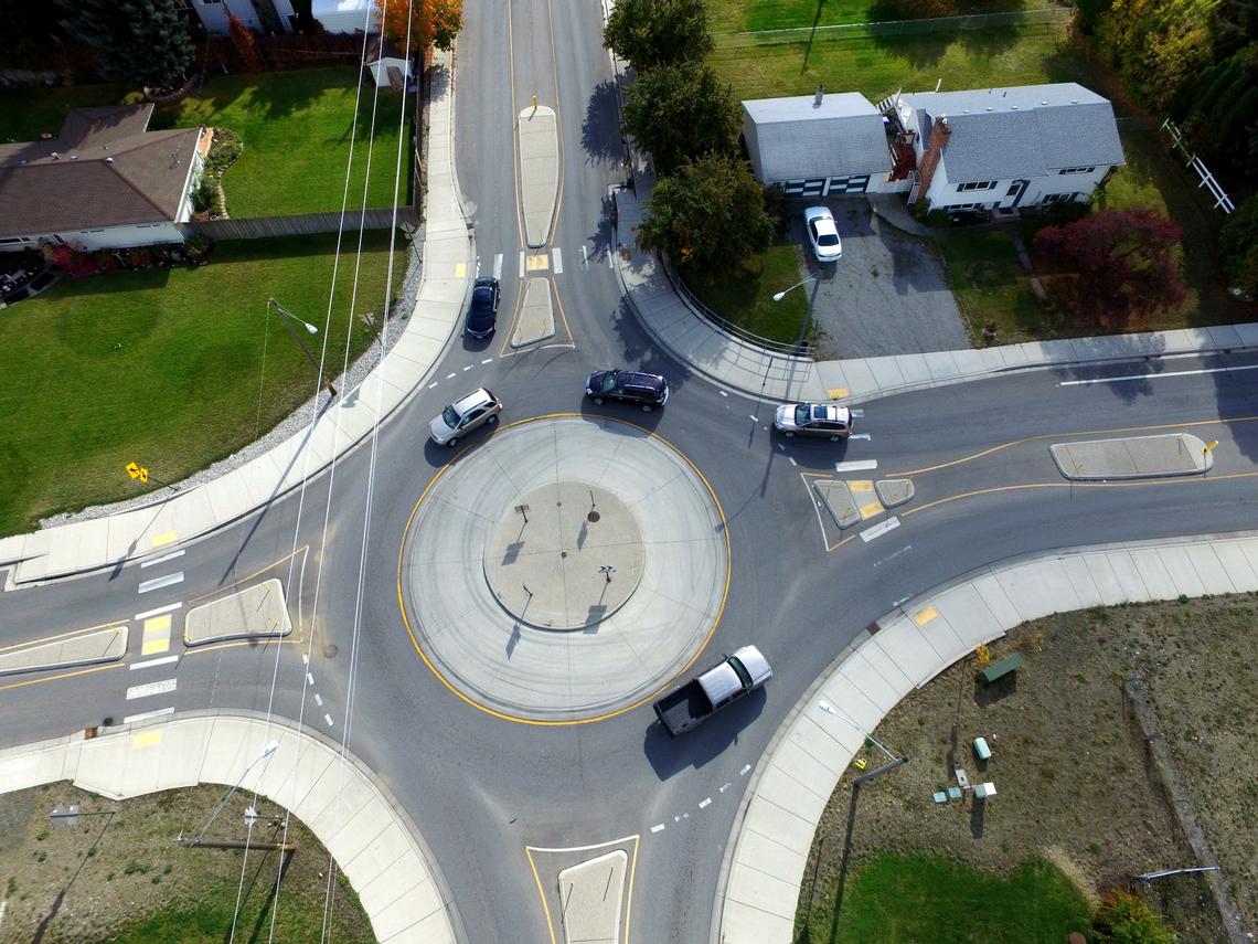 The roundabout at Flora Road and E. Broadway Avenue is one of Spokane Valley’s newer additions to traffic flow in the city. (Jesse Tinsley/SR photo)
