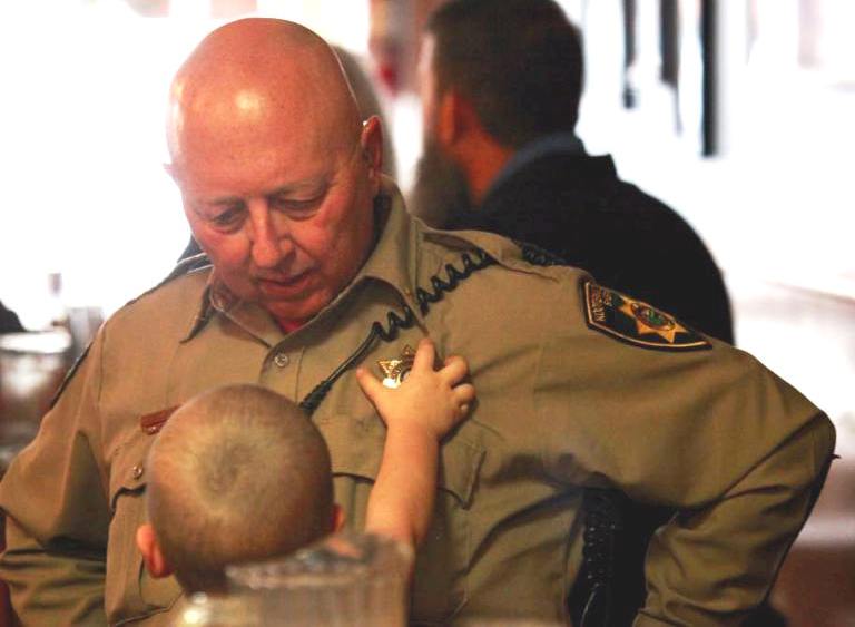 “Democrat” Tina Kunishige isn’t the only one after Kootenai County Sheriff Ben Wolfinger’s badge. Here, Ben’s grandson grabs at the sheriff’s badge after a Kootenai County Democratic Club forum at the Iron Horse Friday. (Duane Rasmussen photo)