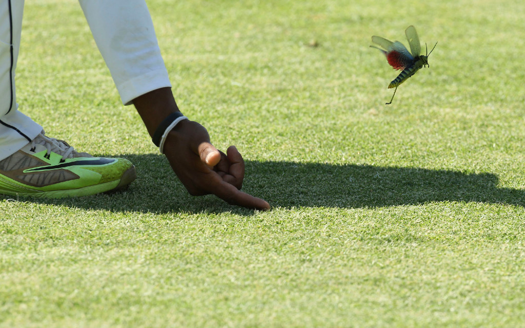 Sri Lanka player Dilrwuan Perera prompts a flying insect off the pitch during the test cricket match against Zimbabwe at Harare Sports Club in Harare Monday. You write the cutline. (AP Photo/Tsvangirayi Mukwazhi)