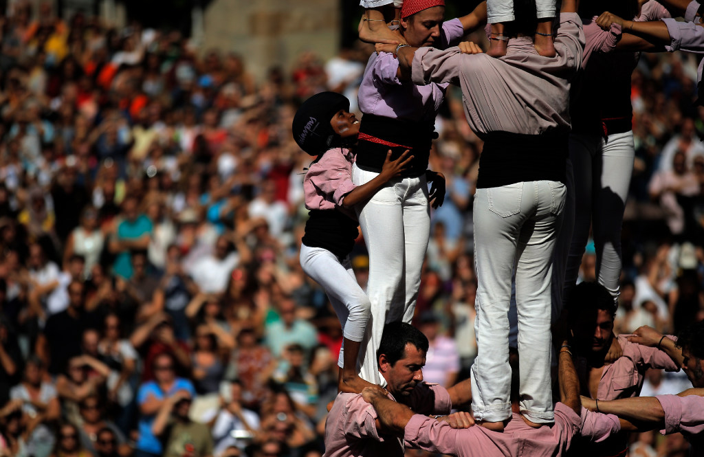 Members of the Castellers form a human tower or “Castell” during the recent Saint Merce celebrations in San Jaime square in Barcelona, Spain. The tradition of building human towers or ‘castells’ dates back to the 18th century and takes place during festivals in Catalonia, where ‘colles’ or teams compete to build the tallest and most complicated towers. You write the cutline. (AP Photo/Manu Fernandez)