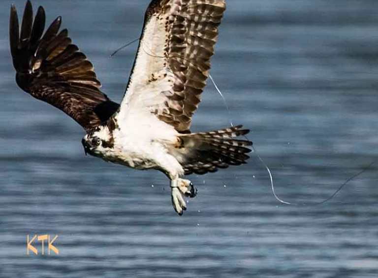 An osprey has fishing line tangled in its wing after diving for fish at Hayden Lake. Rich Landers/SR Outdoors comments on the photo here. (Kasue Krumpleman / Coeur d’Alene Audubon Society)