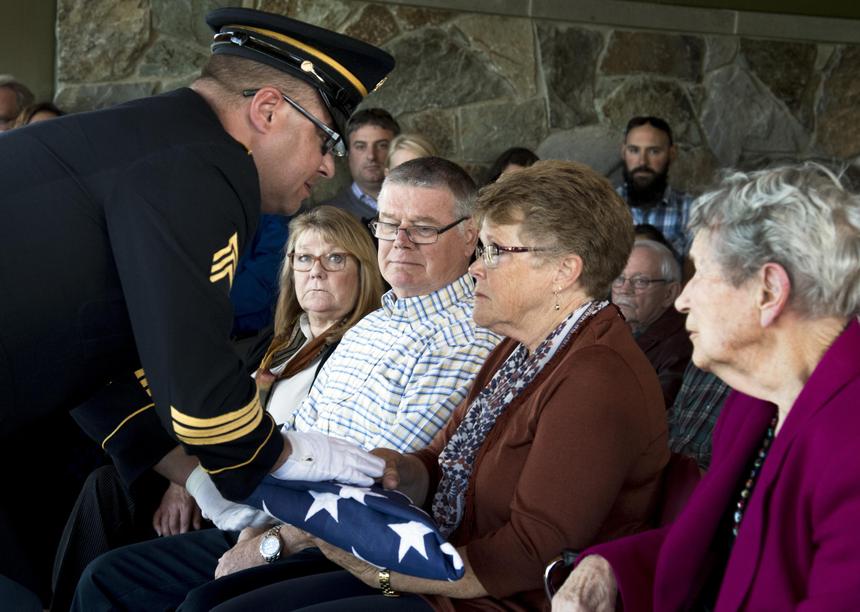 SR photogs covered the service for Peter Bang at the Washington State Veterans Cemetery. Bang, like the fella in “Saving Private Ryan,” was sent home after two of his brothers were killed in World War II. Five Bang siblings served in World War II. Here, Staff Sgt. Bennett Danelo with the Washington Army National Guard presents Bang’s daughter, Christi Strozyk, with an American flag Tuesday. Bang died Sept 11. You can see the SR photo gallery featuring the Bang family and services for Peter Bang here.