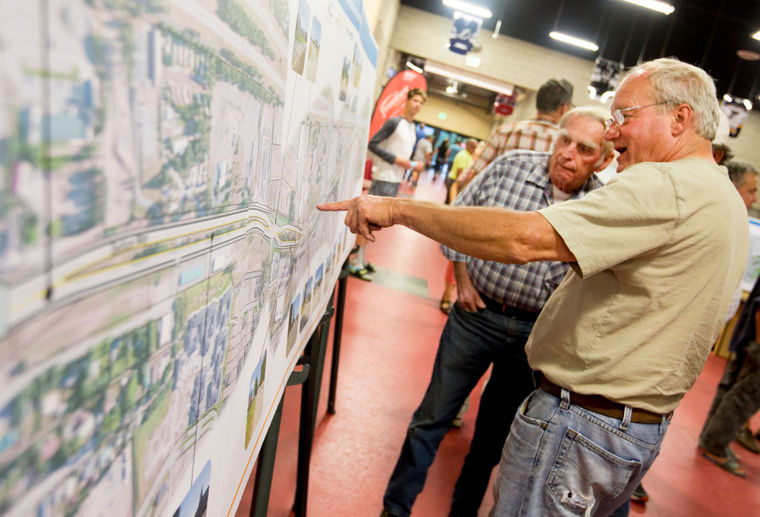 Coeur d’Alene residents Glen Waddell, left, and Rob Lunceford get a closer look on Wednesday at a Welch Comer Engineers concept map detailing the $4.5 million revitalization of Seltice Way. More here. (Loren Benoit/Coeur d’Alene Press photo)