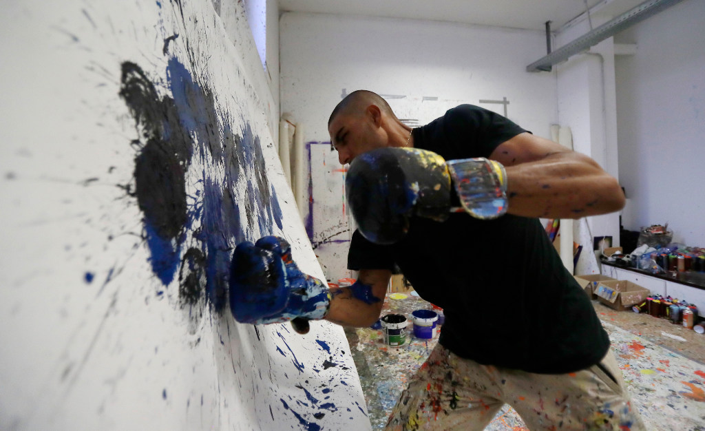 Omar Hassan punches the canvas to paint his creations in his studio in Milan, Italy. When he creates art work, Omar Hassan doesn’t get out paint brushes. He gets out his boxing gloves. Hassan, a 29-year-old artist and boxer, has combined his two passions, with the goal to bring the disciplines closer. His paintings sell from 8,000 to 40,000 euros. You write the cutline. (AP Photo/Antonio Calanni)