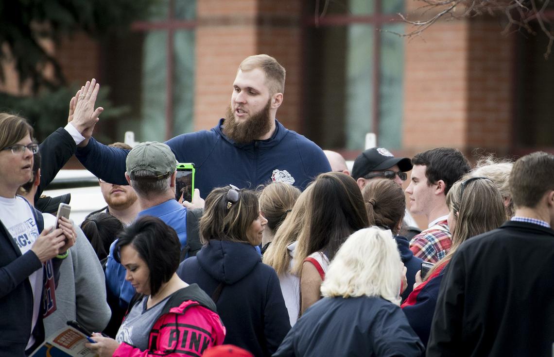 Przemek Karnowski signs autographs at a homecoming rally for the Gonzaga basketball team at Gonzaga University. (Colin Mulvany / The Spokesman-Review)