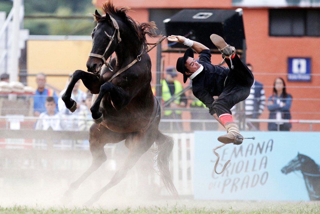 A gaucho is thrown off a wild horse during the Criolla del Prado rodeo in Montevideo, Uruguay. You write the cutline. (AP Photo/Matilde Campodonico)