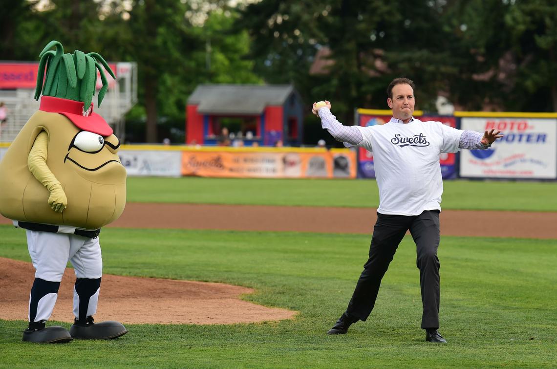 Chris Garratt, chair of the Visit Walla Walla campaign, pitches the first onion at the Walla Walla Sweets baseball game at Borleske Stadium in Walla Walla. Rather than throw out the first pitch, honorees for the Walla Walla Sweets baseball team throw out the first onion. You can read all about it here. (Jesse Tinsley / The Spokesman-Review)