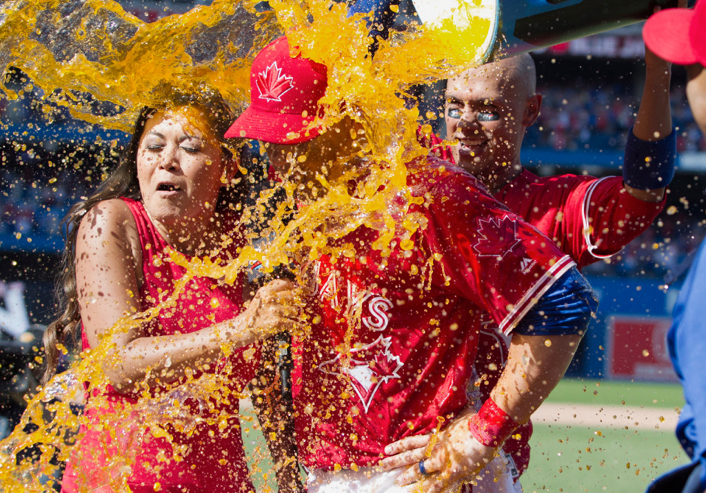 Toronto Blue Jays’ Steve Pearce is doused by teammates while being interviewed by Sportsnet’s Hazel Mae, left, after hitting a walkoff grand slam to defeat the Los Angeles Angels in a baseball game in Toronto Sunday. (Fred Thornhill/The Canadian Press via AP)
