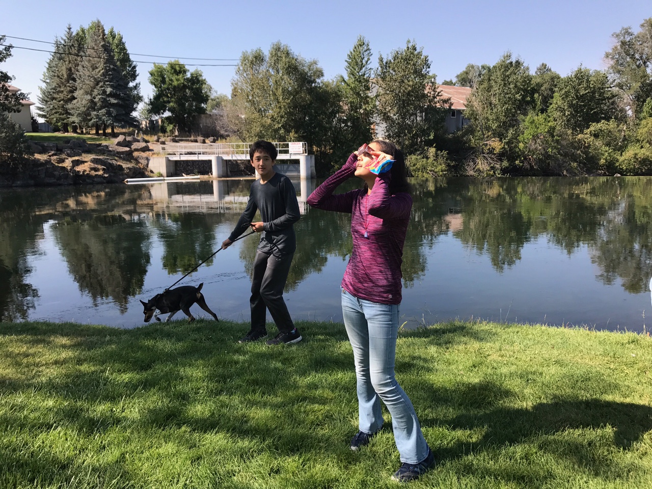 Sabrina Mueller, and her brother, Sebastian, were walking their dog Toby around the lawn at the park, and stopped to share a pair of our eclipse glasses. Their dad, Joachim, had fashioned a viewer of his own out of a water-filled glass bottle darkened on the outside with soot from a candle. Though that initially sounded iffy to us, it turns out that Joachim is a physicist from Minneapolis, and he made a similar viewer when he witnessed a total solar eclipse as a teenager growing up in Germany. “The whole school was closed – we were out in the yard,” he remembered. He explained that the soot filtered visible radiation; the water filtered infrared radiation; and the glass filtered UV radiation. As a teen, he hadn’t used the water; luckily, they’d only looked at the sun for short periods then.