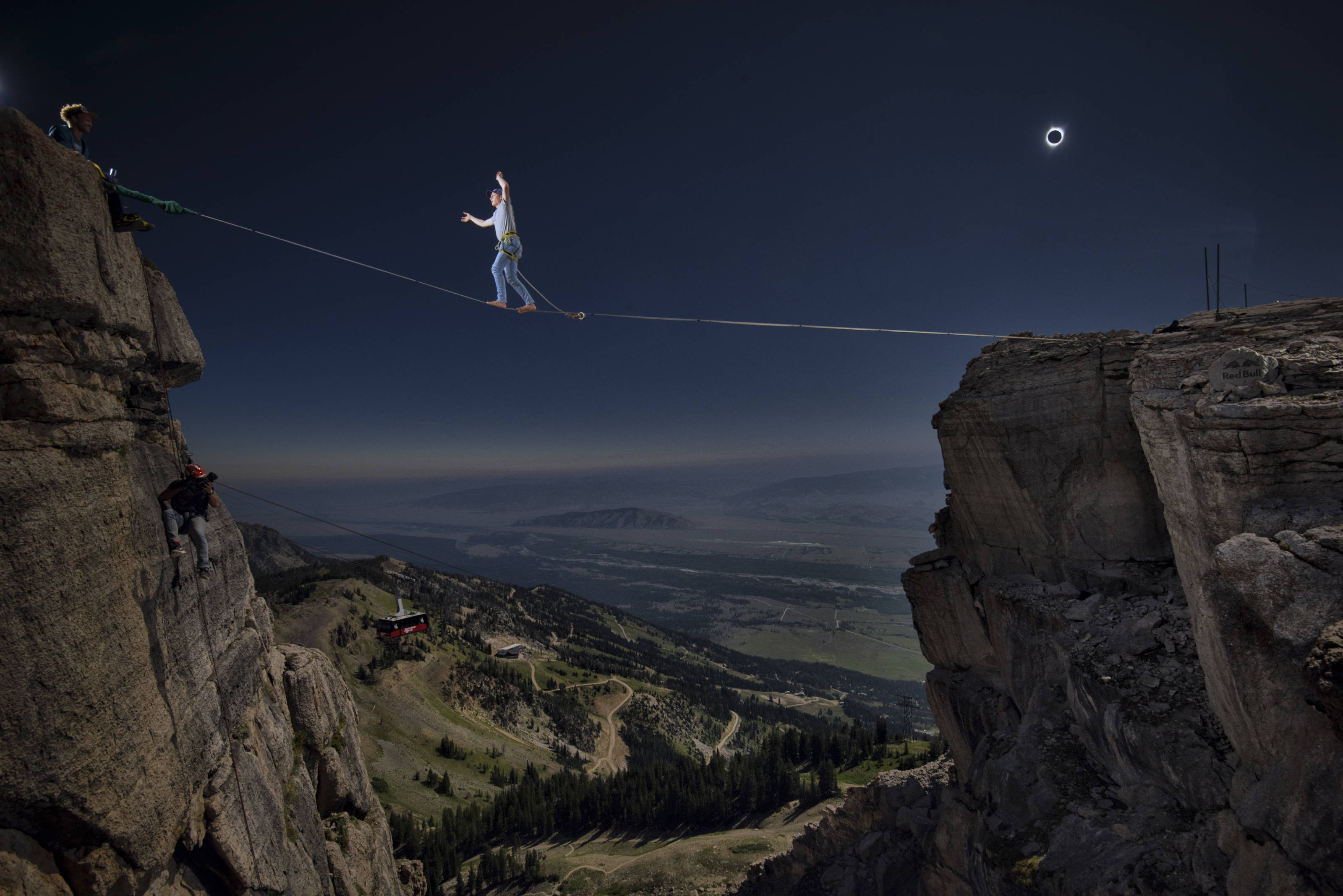 Images of Mason’s slackline display for the eclipse, which lasted roughly two and a half minutes, were made by National Geographic photographer and explorer Keith Ladzinski.