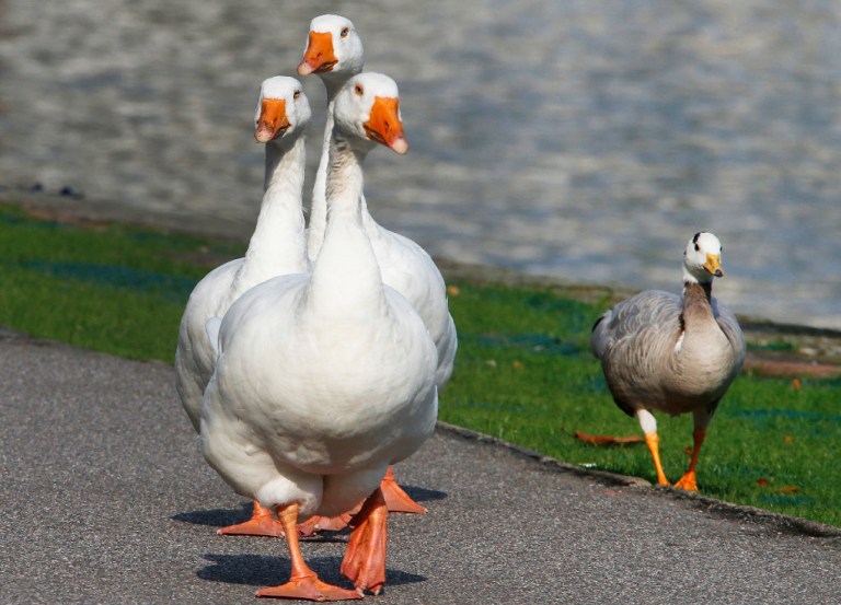 Three big white geese are marching on a way next to a smaller one near the river Main in Frankfurt, Germany Tuesday. You write the cutline. (AP Photo/Michael Probst)