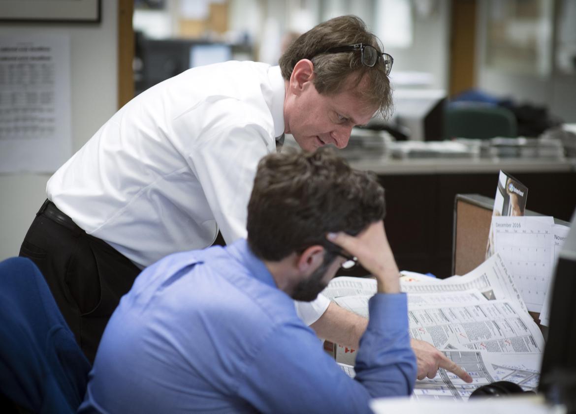 Spokesman-Review Editor Rob Curley and Assistant City Editor Jonathan Brunt work on newspaper election coverage layouts. (Colin Mulvany / The Spokesman-Review)