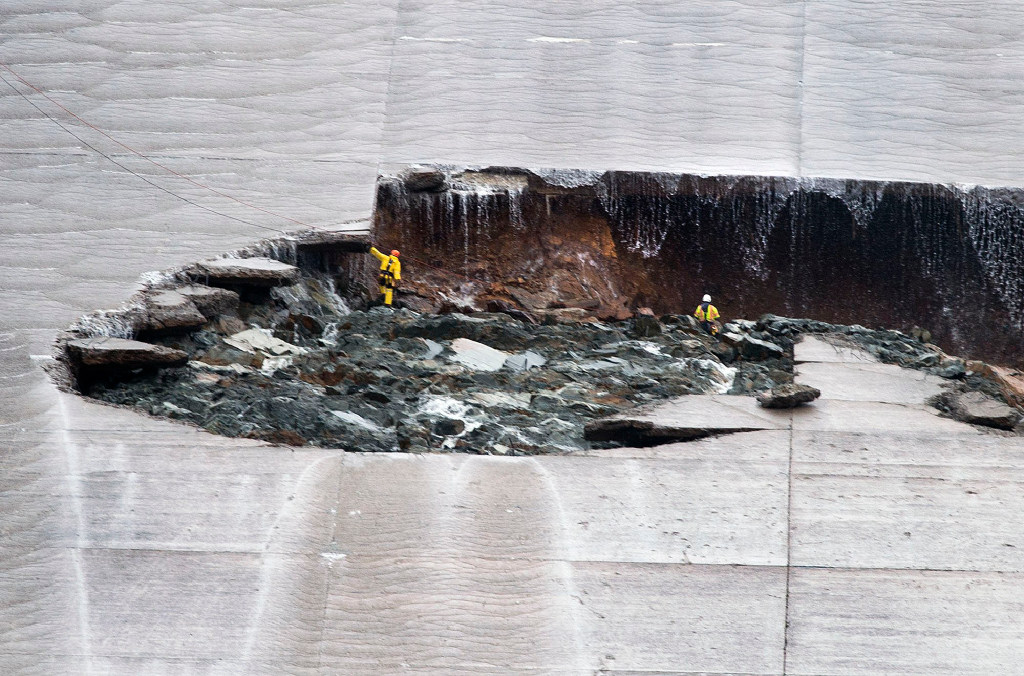Water trickles down as workers inspect part of the Lake Oroville spillway failure on Wednesday in Oroville, Calif. The Department of Water Resources said the erosion at Lake Oroville does not pose a threat to the earthen dam or public safety, and the reservoir has plenty of capacity to handle the continuing rain. (Randy Pench/The Sacramento Bee via AP)