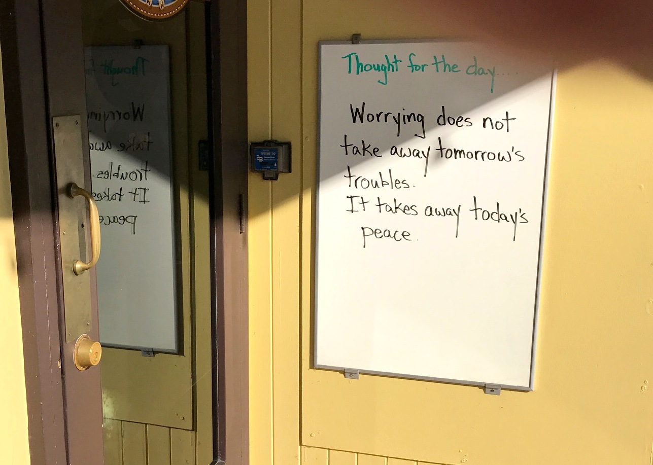 “Worrying doesn’t take away tomorrow’s troubles, it takes away today’s peace” — handwritten Thought for Today at entrance of The Leather Works on Sherman Avenue, downtown Coeur d’Alene.