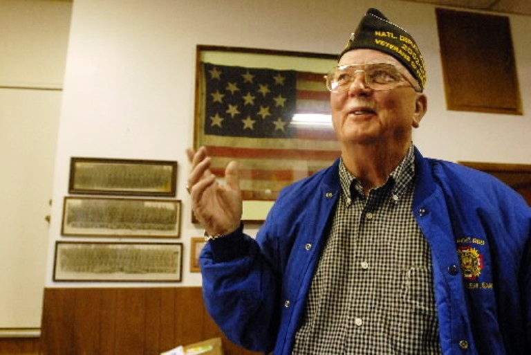 In this SR file photo, WWII veteran Jim Shepperd of Coeur d’Alene relates stories of Coeur d’Alene war veterans prompted by the display area at the Veterans of Foreign Wars Post 889 building in Coeur d’Alene on Oct. 24, 2006. Huckleberries has learned from a family member that Jim, 90, died peacefully at a friend’s house in Hayden Monday night or Tuesday morning. Services will be at 10 a.m. Saturday at Yates Funeral Home. You can read an SR story re: Jim’s dedication to Memorial Day here . (Jesse Tinsley/SR file photo)