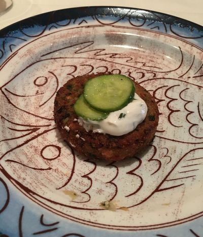 Our first stop was at Kokorri , a Greek restaurant, where we had lunch. We shared appetizers — spanakotiropita (spinach tarts), zucchini cakes (see the photo above), grilled octopus and grilled lamb riblets — and a chopped salad (romaine lettuce, roasted pine nuts, Kalamata olives, fresh dill all mixed with a perfectly sparse amount of creamy feta dressing).