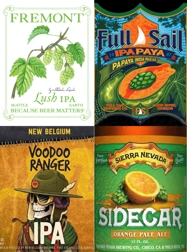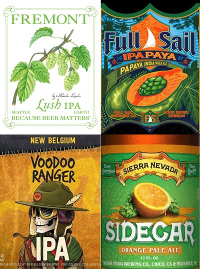 Counterclockwise, from top left: Fremont has already released its spring seasonal Lush IPA; New Belgium’s IPAs are moving under a new Voodoo Ranger label; Sierra Nevada is introducing an orange version of its iconic pale ale; Full Sail’s latest Pub Series offering is a papaya-infused IPA.
