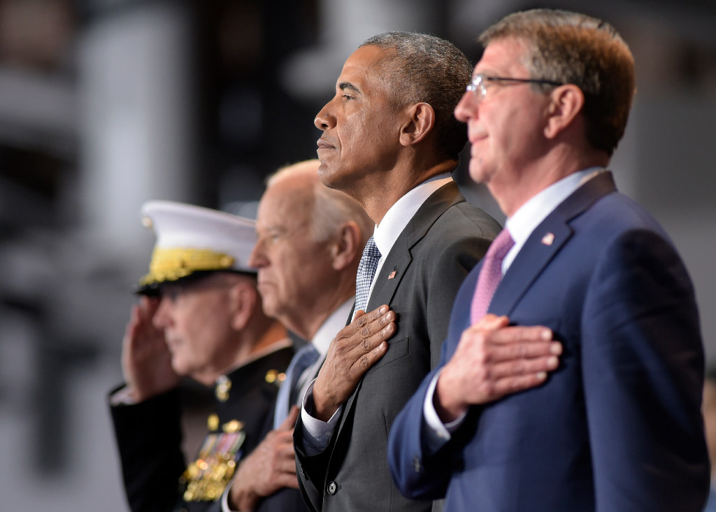 President Barack Obama, stands with, from left, Joint Chiefs Chairman Gen. Joseph Dunford, Vice President Joe Biden, and Defense Secretary Ash Carter, as they listen to the National Anthem during an Armed Forces Full Honor Farewell Review for the president, Wednesday at Conmy Hall, Joint Base Myer-Henderson Hall, Va. (AP Photo/Susan Walsh)
