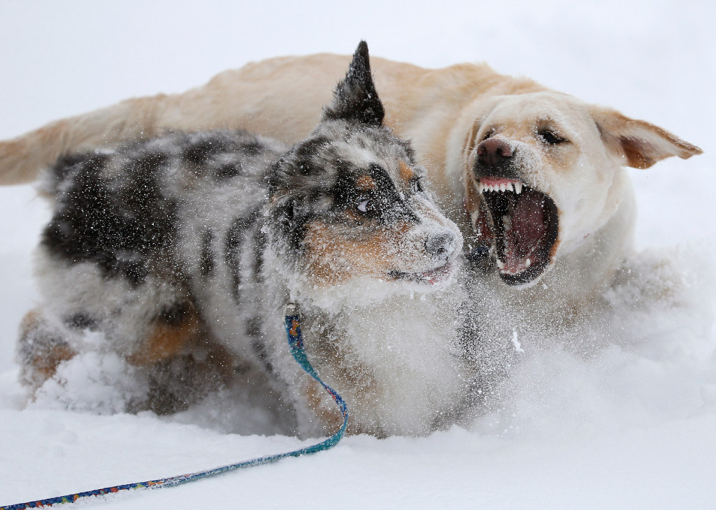 Labrador Frankie and Australian Shepherd Blue, who both belong to the same family, play rough in the snow during a break in a winter storm, at a park in Boulder, Colo., earlier today. A winter storm has dropped several feet of snow in the Colorado high country, and over a foot in Front Range communities. (AP Photo/Brennan Linsley)