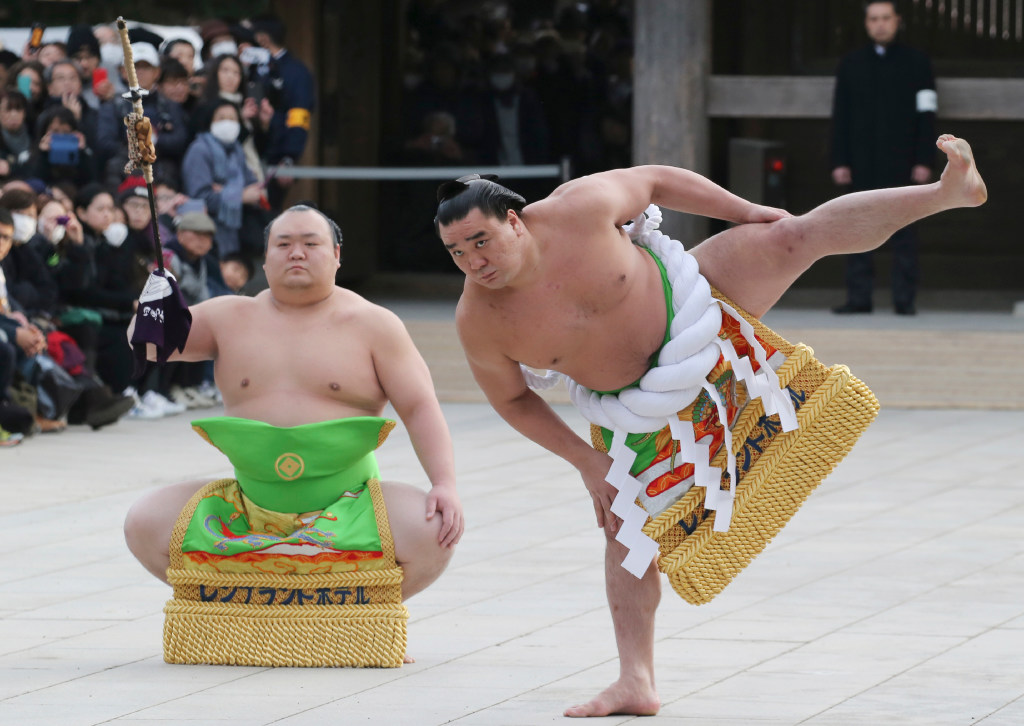 Sumo grand champion Harumafuji, right, of Mongolia performs his ring entry forms as Takarafuji holds a sward at the Meiji Shrine in Tokyo Friday. You write the cutline. (AP Photo/Koji Sasahara)