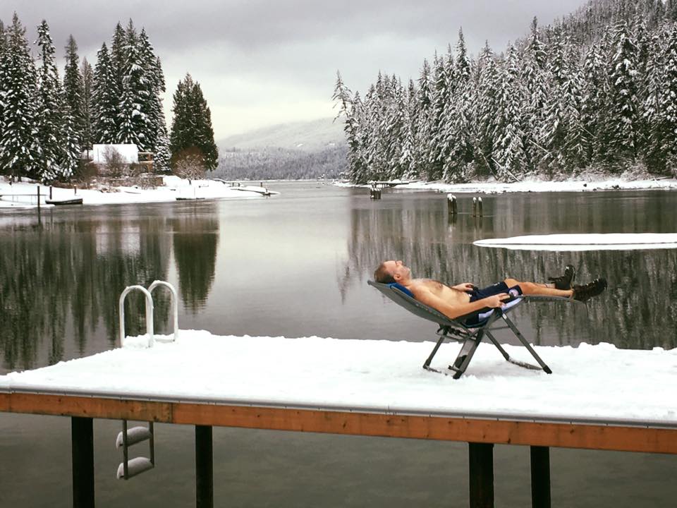 We’ve been focused on Polar Bear plungers so far this year. But here with have a Polar Bear lounger. Priest Laker David Smith hung out in his lounge chair lake side after shoveling 18 inches of snow from his deck and dock. Wife, Danielle, who provided this photo via Pecky Cox’s Priest Lake Facebook site, tells us that David was over-warm from the exercise and didn’t mind the 15-degree temperature or snow all around him.
