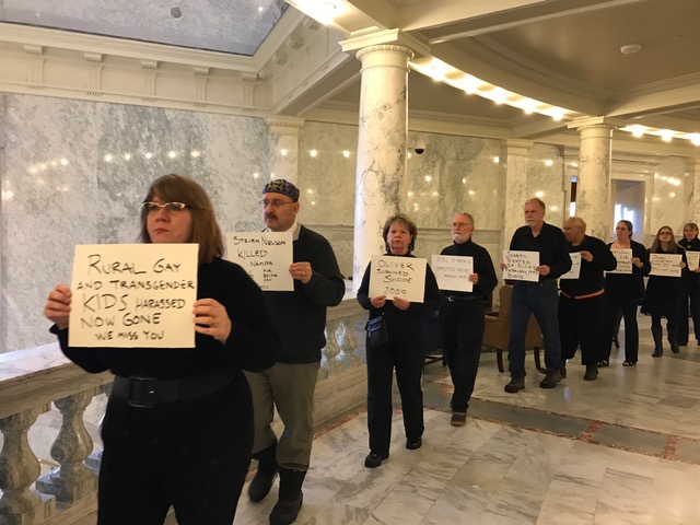 An array of protesters from “Add the 4 Words Idaho” were in the Capitol rotunda today, carrying signs about ways specific Idahoans have suffered because of discrimination or harassment over their sexual orientation or gender identity. Gov. Butch Otter walked by a large number of protesters as he left the House chamber after delivering his State of the State address today.