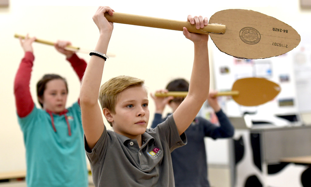 Sorensen Magnet School for the Arts & Humanities 6th grader A.J. Alexander center paddles to music at the school in Coeur d’Alene earlier today. The students are studying the art and culture of Hawaii. With guidance of local dance instructor, Bria Zan Thompson, students will also participate in a whole-school performance combining native dance, singing, percussion and storytelling e lements. (Kathy Plonka/SR photo)