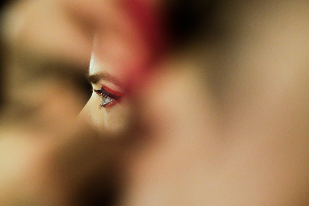 A model gets prepared prior to the fashion show of designer Rebekka Ruetz during the Mercedes Benz Fashion Week in Berlin, Wednesday. (AP Photo/Markus Schreiber)