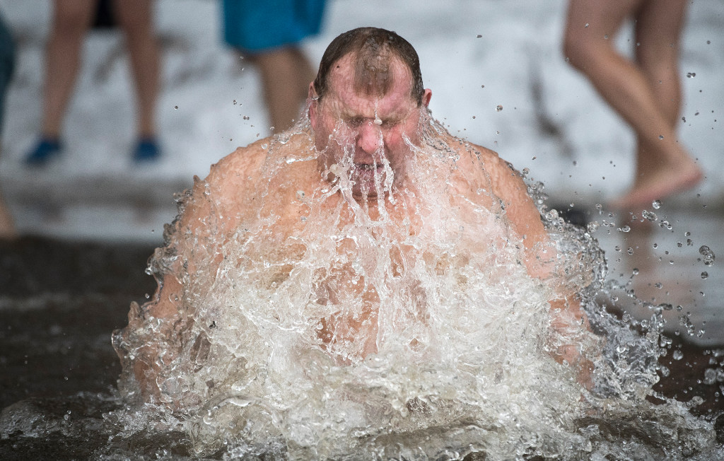 A Lithuanian Orthodox believer bathes in the icy water during Epiphany in a lake outside Vilnius, Lithuania, Thursday. You write the cutline. (AP Photo/Mindaugas Kulbis)