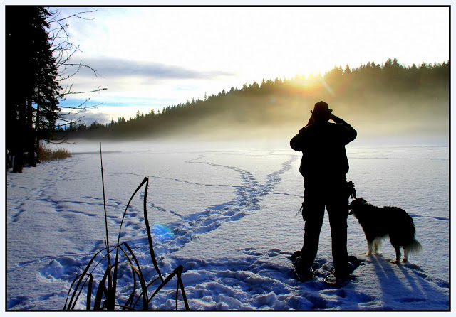 Bill Love, with his dog, Kiwi, surveys the ice and snow on Dawson Lake, northeast of Bonners Ferry, during an outing with his wife, Marianne, the photographer/blogger of Slight Detour. Don’t forget to check out more of Marianne’s photos from that trip here.