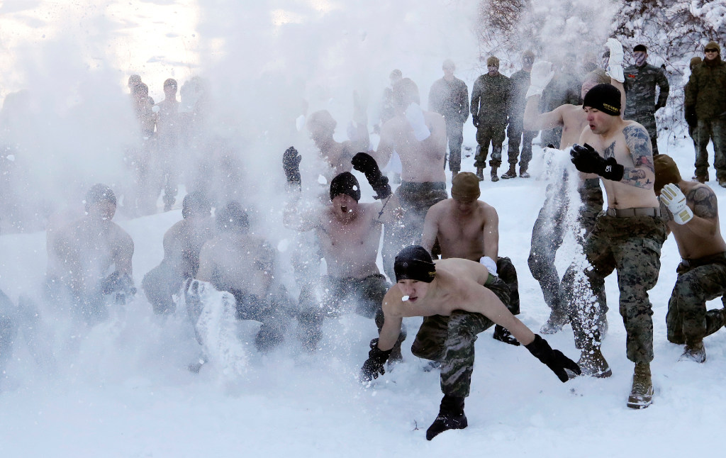 South Korean Marines and U.S. Marines from the 3rd Division Expeditionary Forces throw snow during a combined military winter exercise in Pyeongchang, South Korea, earlier today. Marines from South Korea and U.S. are participating in a four-week winter combined exercise in South Korea. You write the cutline. (AP Photo/Lee Jin-man)