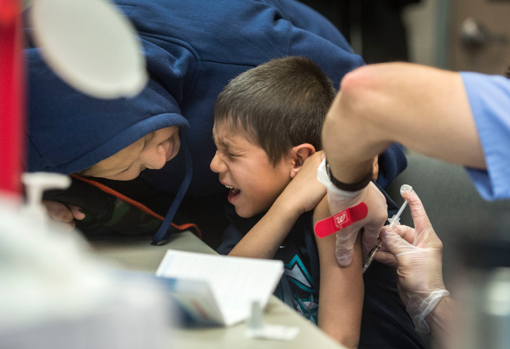 Tony Chavez, 7, gets a measles-mumps-rubella (MMR) vaccination from WSU College of Pharmacy student James Kent, right, and encouragement from his mother, Kelly Thomas, left, during the Homeless Connect event at the Salvation Army today. UnitedHealthcare, in partnership with the Salvation Army, Walgreens and Spokane Regional Health District offered free mumps flu shots. Hundreds of people gathered to partake of the free services including hot meals, family services, veterans services food bank warrent fest and veterinary care for pets. (Dan Pelle/SR photo)