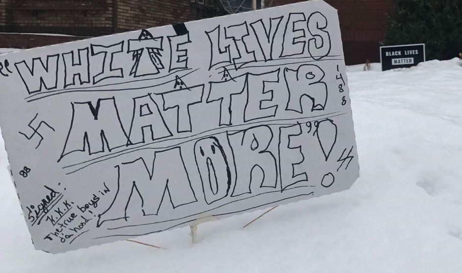 A Spokane woman who recently returned from the Woman’s March in Washington D.C. woke up Wednesday morning to a racist sign in her front lawn. The woman wishes to remain anonymous but says she’s Hispanic. The sign placed in her yard reads, “White Lives Matter More! Signed: K.K.K. The true boys in da hood!” The sign also includes images of swastikas, what appear to be KKK cartoons and the numbers “14” and “88” numbers that have significance to white supremacy/ Nichole Mischke , KHQ. More here .