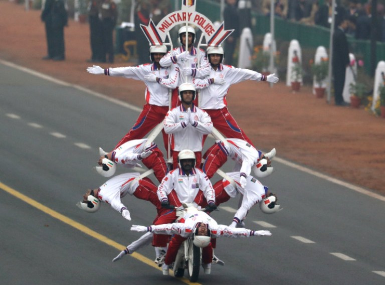 Indian Army daredevils display their skills on a motorcycle during Republic Day parade in New Delhi, India, Thursday. You write the cutline. (AP Photo/Manish Swarup)